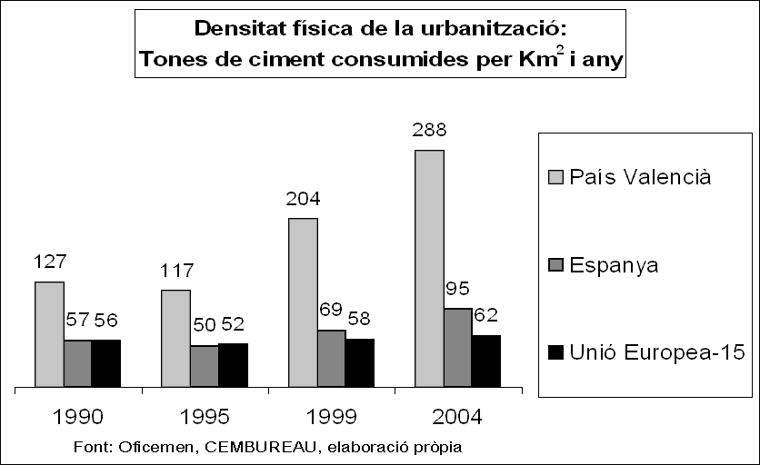 Primeres alenades d’una resurrecció? Qui ho sap! Una lectura possible partiria de les dinàmiques econòmiques i urbanístiques que han dominat l’última fase del desenvolupament valencià. La conversió d’una economia productiva complexa i diversificada en monocultiu immobiliari ha generat tota mena de desequilibris. I els costos n’han estat severs. Són visibles en l’empremta sobre el territori (ja ho sap tothom, llevat del conseller Blasco). Els efectes de pertorbació mediambiental, destrucció de paisatges, brutalitat visual i corrosió espiritual són omnipresents. Poca sorpresa en això: la deposició de ciment per unitat de superfície és quasi cinc vegades més gran que a la resta d’Europa, i tres vegades més gran que al conjunt espanyol (vegeu el gràfic adjunt).